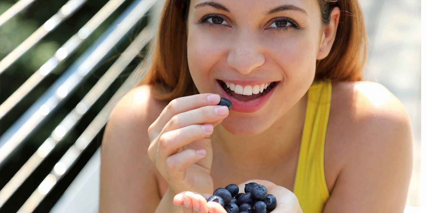 A woman eating blueberries
