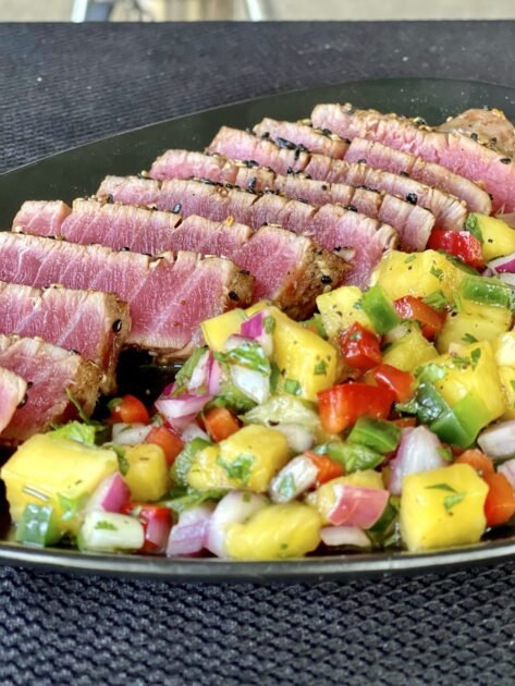 Remove the tuna steaks and slice for serving, plate and add your pineapple salsa.