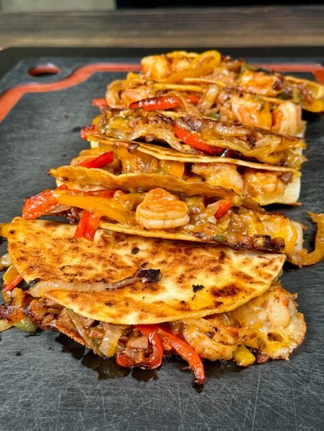 Once the tacos are toasted, remove them from the griddle and serve them immediately. These tacos are perfect for a casual dinner or as part of a larger spread for a gathering. The combination of smoky Andouille sausage, succulent shrimp, and savory sautéed vegetables with the creamy Avocado Lime Crème is sure to be a crowd-pleaser. Enjoy!