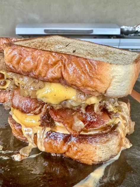 A classic Patty Melt is one of the greatest comfort foods to devour. This Animal Style Patty Melt elevated that experience by caramelizing onions into a mouthwatering jam that sits on top of the patty melt a mountain of perfectly grilled burgers smothered in gooey American cheese. Did I mention that this creation is two patties and between them are crispy strips of bacon? patty melt in a hand