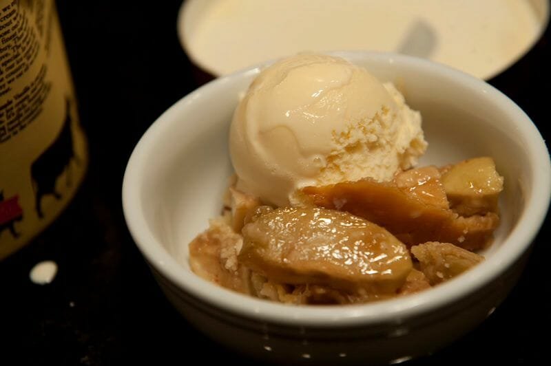 Sprinkle the topping over the apples. It’ll be a lot so you’ll have to mound it on top and be careful to keep it from spilling over.