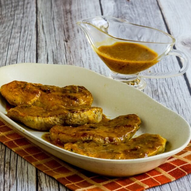 When we decided to update the photos for this recipe Kara and I both felt the original method that browned the pork chops and then roasted them in a preheated 350F/176C oven for 8-10 minutes while you make the sauce was more steps than the recipe needed. For the updated method, we browned the pork chops, removed them to a plate while we made the sauce in the pan, and put pork chops back into the sauce to finished cooking. We also increased the recipe to use 4 pork chops, but only slightly increased the amount of sauce (and used lower-carb apricot preserves) which made this recipe even lower in carbs. (If you were a fan of the original method of browning and then roasting the pork chops, you can definitely still make them that way.)