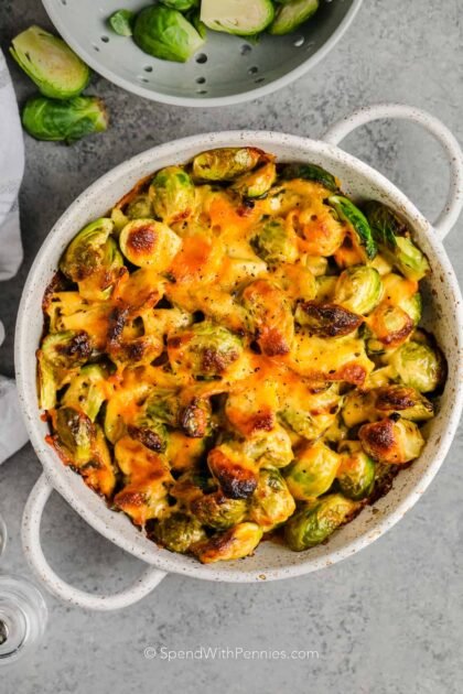 - Bake: Transfer the sprouts to a casserole dish and pour the cheese mixture overtop. Sprinkle with more cheese and bake browned and bubbly.
