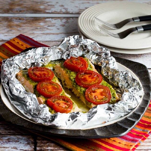 You can serve Baked Salmon with Pesto and Tomatoes right in the foil if you’d like, for a dinner that’s sure to please anyone who likes salmon. Add something like Sweet and Sour Cucumber Salad, Marinated Zucchini Salad, or Zucchini Noodle Mock Pasta Salad for a low-carb meal!