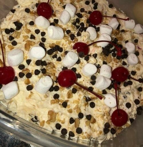 - Add in the nuts, the marshmallows the bananas, the chocolate chips, and the cherries, from there, stir all of this into there until it makes a whole mixture that’s properly incorporated.