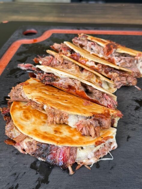 Now that your brisket is smoked to perfection and your elote is ready, it’s time to assemble the tacos. Start by warming the tortillas on a griddle or in a dry skillet until they’re soft and pliable. up close of the elote tacos on a cutting boardOnce warmed, place a tortilla on the griddle and add a handful of shredded cheese, followed by chopped brisket. Fold the tortilla in half, pressing it gently so that the cheese melts and the tortilla crisps up on both sides. Cook until the cheese is fully melted and the tortilla is golden brown and slightly crispy.
