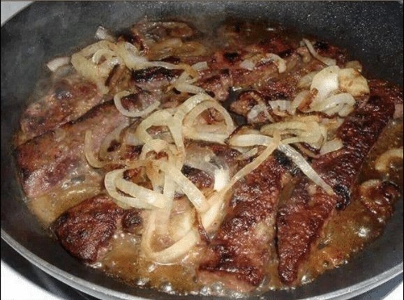 Thin slices of beef liver are cooked in olive oil, then served with caramelized onions. Make sure not to overcook the liver! When cooked to medium rare it’s tender and sweet.