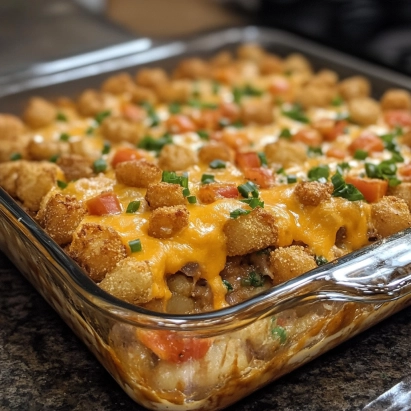 6. Bake for 25-30 minutes, or until the tater tots are golden brown and crispy.