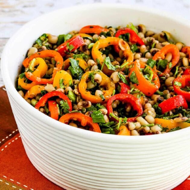 Black eyed peas do have some carbs of course, but this tasty salad only has 19 net carb per serving, and that’s not a huge splurge to get good luck in the new year! Use a bit less blak-eyed peas and more peppers if you want a version with fewer carbs.