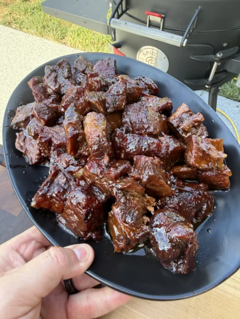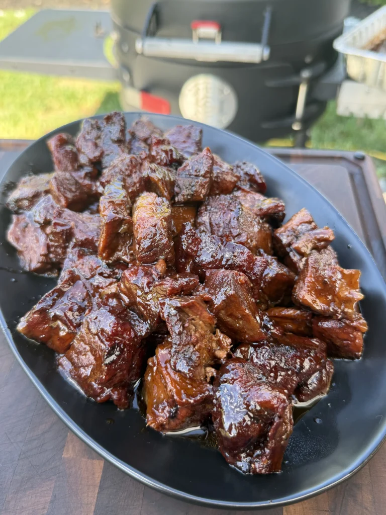 Serve immediately with toothpicks for easy eating as finger food, pile them on slider buns for mini sandwiches, or serve them over creamy mac and cheese where they become the star protein. Each bite should deliver tender, juicy beef with a smoky bark coating and sticky-sweet bourbon-maple glaze that balances smoke, sweet, savory, and rich beef flavor. Any leftovers can be refrigerated in an airtight container for up to four days and reheated gently in a 300°F oven or smoker with a splash of extra glaze to refresh the coating.eef with a sticky-sweet bourbon-maple coating and lingering smoke flavor. Any leftovers can be refrigerated in an airtight container for up to four days and reheated gently with a splash of extra glaze.