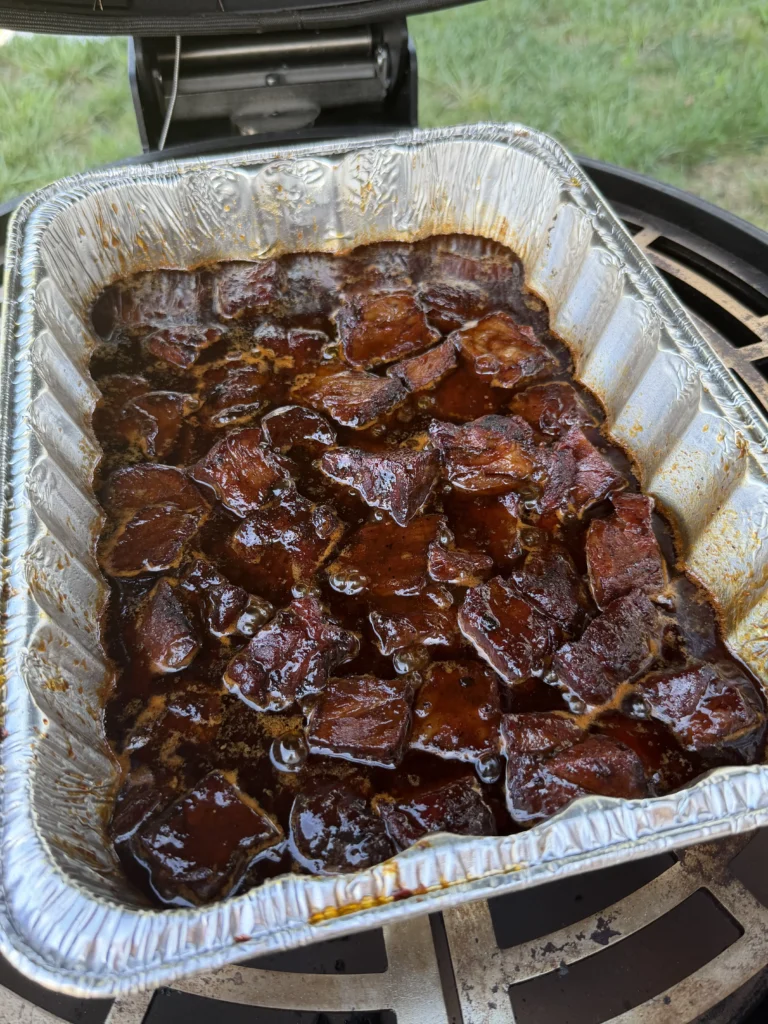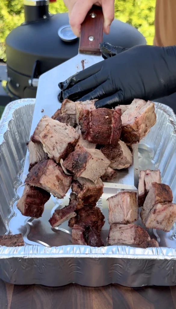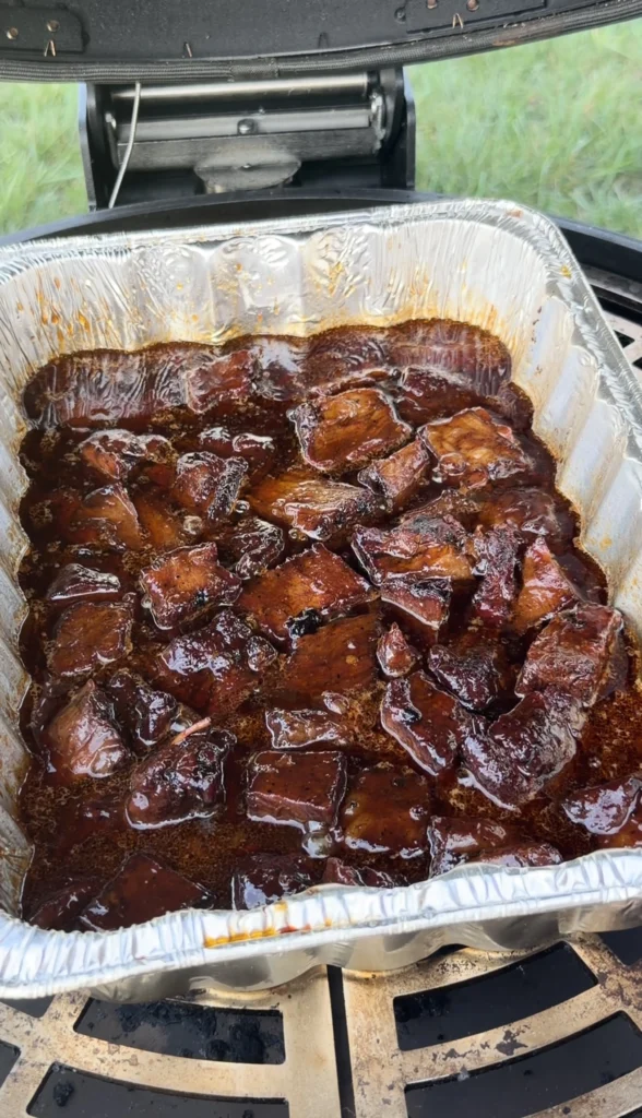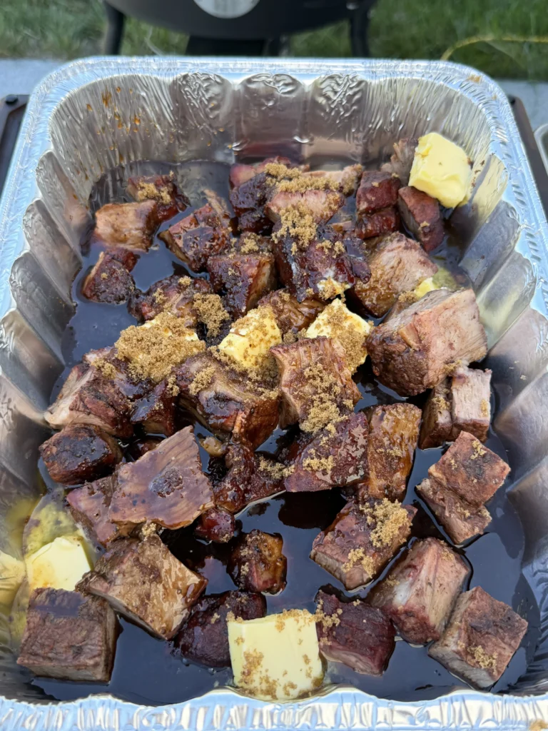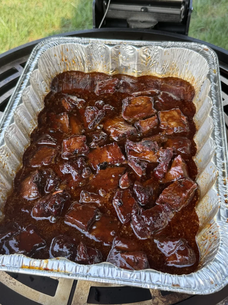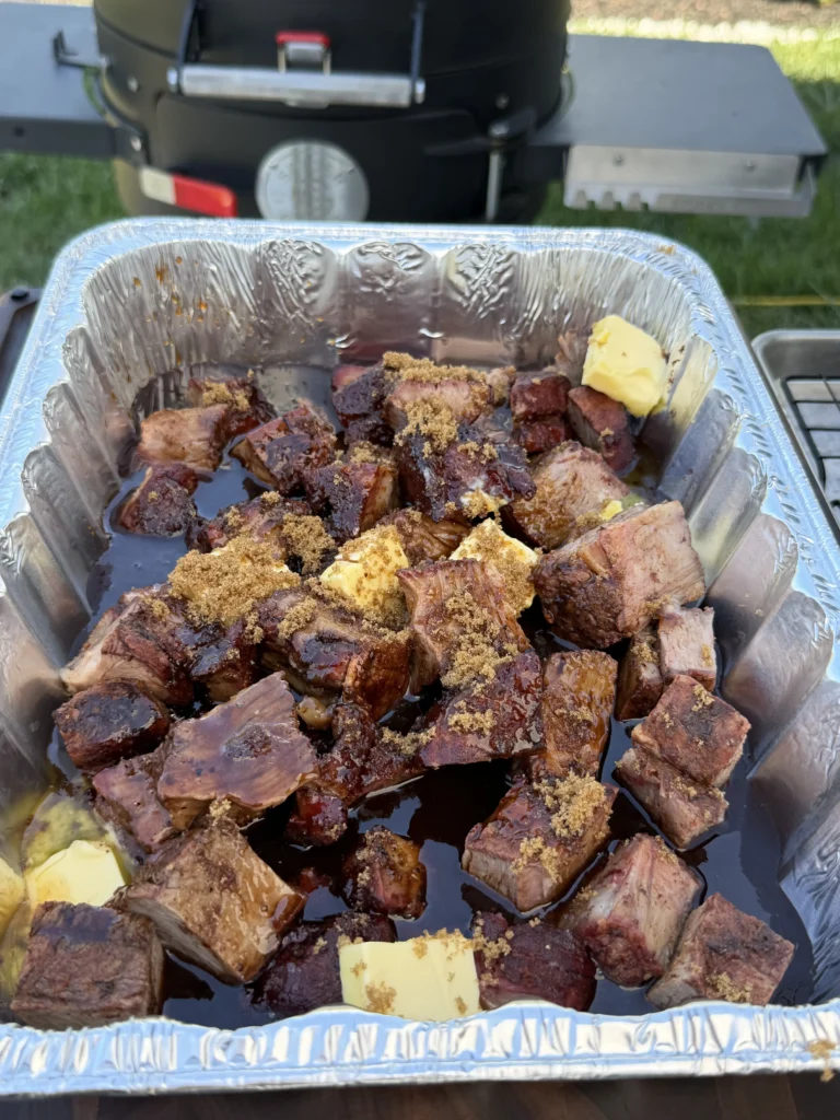 After about ninety minutes, carefully remove the foil to check progress – watch for escaping steam that will be very hot. Insert an instant-read thermometer into several cubes from different areas of the pan to verify temperature. More importantly, probe them – the thermometer should slide in and out with almost no resistance, like pushing into soft butter. If the cubes still feel firm or the thermometer meets resistance, re-cover and continue cooking, checking every twenty to thirty minutes. The braising stage can take anywhere from ninety minutes to two and a half hours depending on cube size and smoker efficiency.