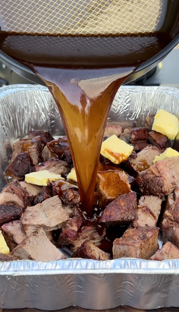 Pour half a cup of beef broth over the cubed smoked chuck roast in the foil pan. The liquid creates steam during braising that keeps everything moist while adding savory depth. For extra bourbon flavor, you can use a splash of bourbon instead of or in addition to the beef broth. The liquid should pool in the bottom of the pan around the cubes but not cover them – you’re creating a steaming environment, not boiling the meat.