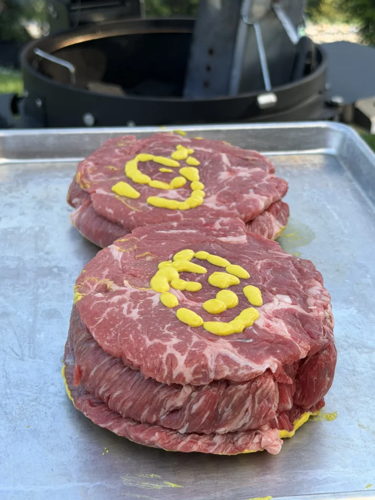 Yellow mustard serves as a binder that helps the BBQ rub adhere to the meat’s surface during the long smoke. The mustard’s moisture creates a sticky layer that seasoning clings to rather than falling off when you move the meat. Despite what you might expect, the mustard flavor doesn’t come through in the finished burnt ends – it simply helps hold the rub in place while adding no detectable taste.