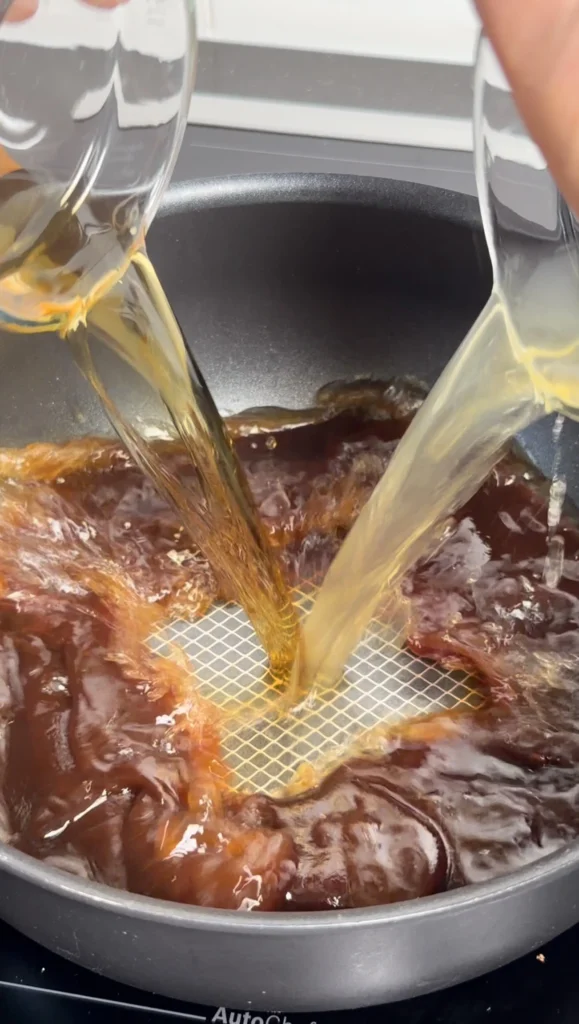 Carefully drain most of the liquid from the pan, leaving just a thin layer at the bottom. Tilt the pan and use a ladle or large spoon to remove excess liquid – you can save this flavorful braising liquid for adding to baked beans or other sides if desired. Draining is important because you want the glaze to coat the meat, not be diluted by excess liquid.