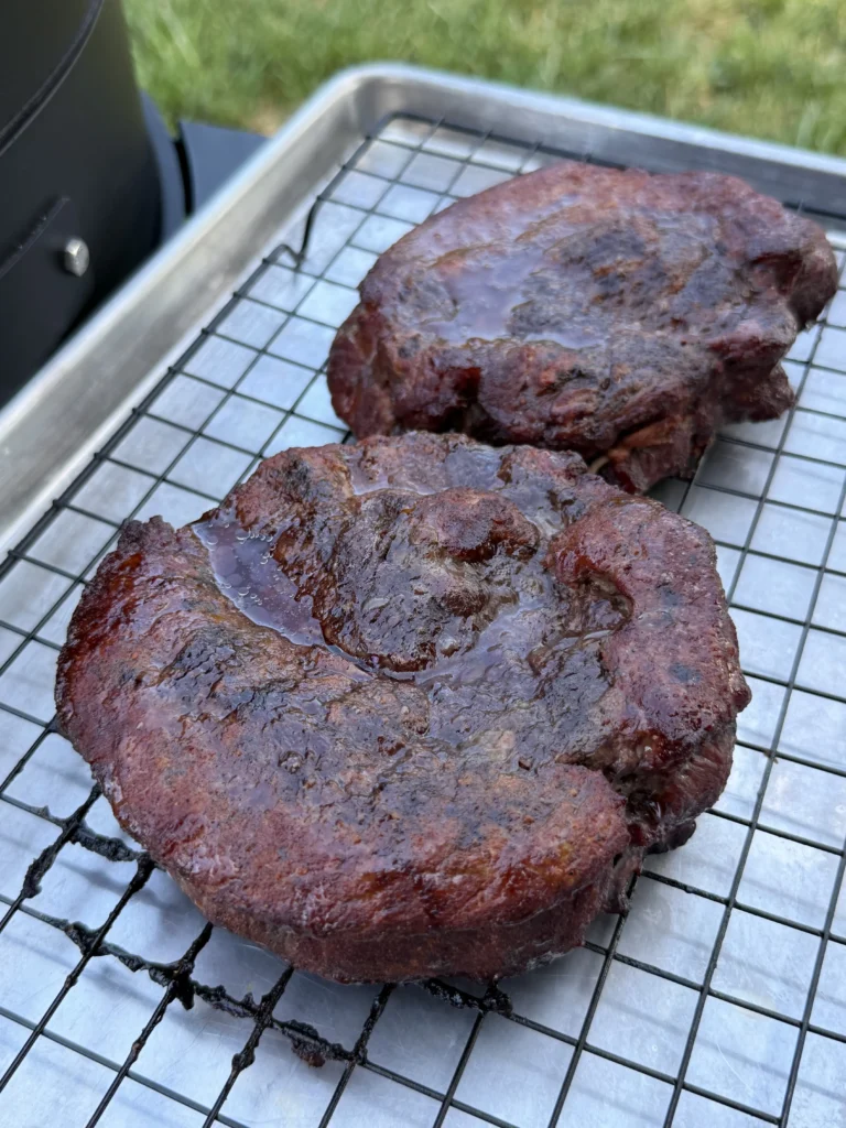 After the first hour, you can check occasionally to monitor bark development and ensure the smoker is maintaining 250°F. Add more fuel as needed for consistent temperature. Continue smoking for approximately three hours total, or until the roasts reach about 165°F internal temperature when checked in the thickest part with an instant-read thermometer. The exterior should have developed a nice mahogany bark – dark, crusty, and aromatic with the seasoning caramelized into a flavorful crust.