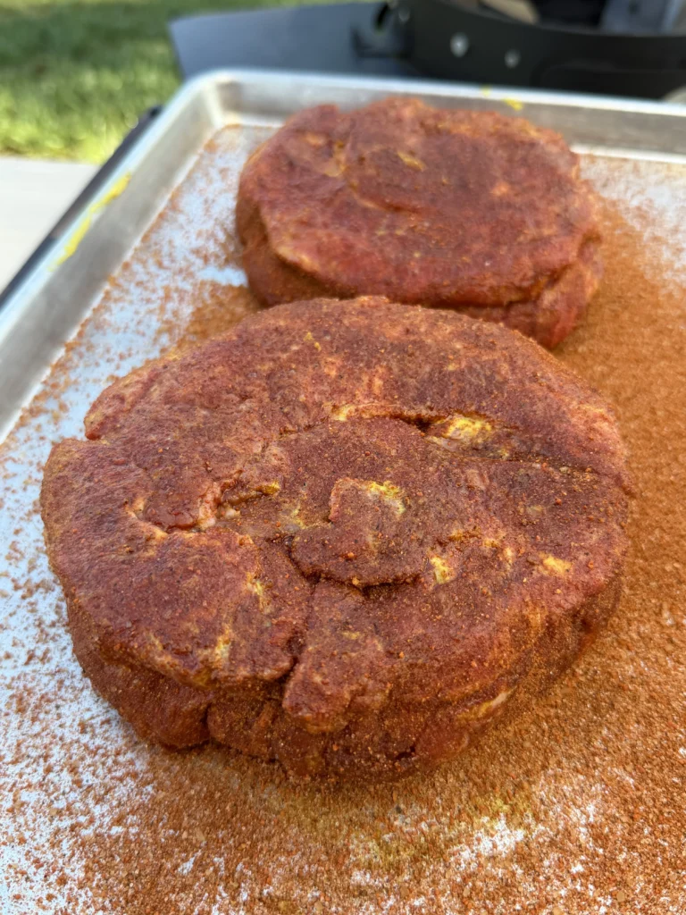 Sprinkle the BBQ rub generously over all surfaces of the mustard-coated roasts. Use a sweet and smoky style rub that will complement the bourbon-maple glaze. You’ll need about half a cup total for four to five pounds of chuck roast. Use your hands to press the rub into the meat, ensuring every surface gets well-coated with no bare spots. The seasoning should form a thick, visible crust over the entire exterior. Let the seasoned roasts sit while you prepare the smoker.