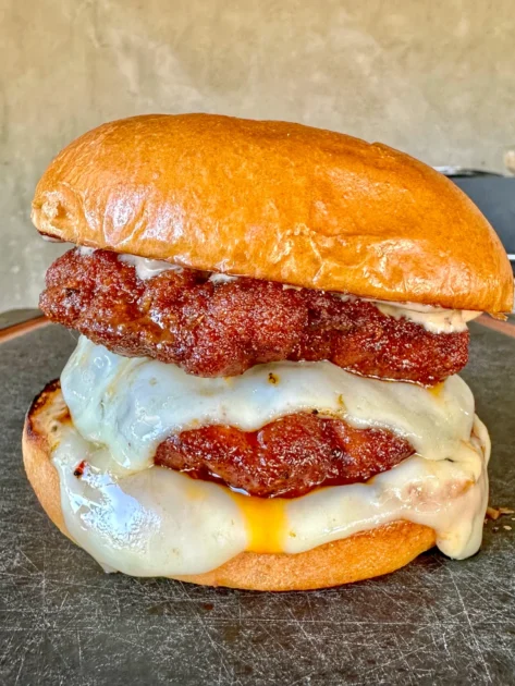 Assemble the sandwich by sauce both buns and then a slice of pepper jack cheese (torch it), fried pork chop, followed by pepper jack cheese (torch it) and then another fried pork chop. Close the lid and serve!