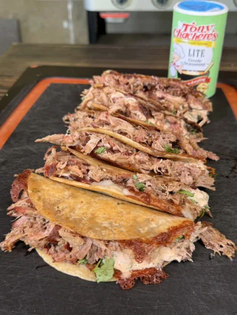 When ready to serve, shred the pork and keep it warm. Heat a griddle and add the tortillas, toasting one side before flipping. Add shredded Oaxaca cheese and pulled pork to each tortilla, then fold to create tacos. Cook until the tortillas are crispy and the cheese has melted. Top each taco with fresh chopped white onion, cilantro, and a squeeze of lime juice. Serve with the Cajun dipping sauce on the side or drizzled over the tacos.