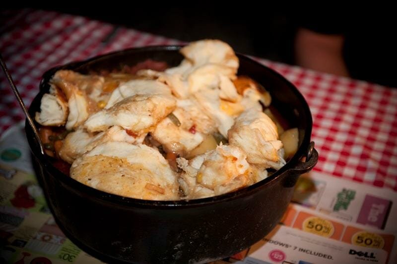 Carefully remove the lid and arrange the biscuits on top of the stew. It’s going to smell absolutely wonderful when you do this and neighboring campers will wonder what you’re cooking!