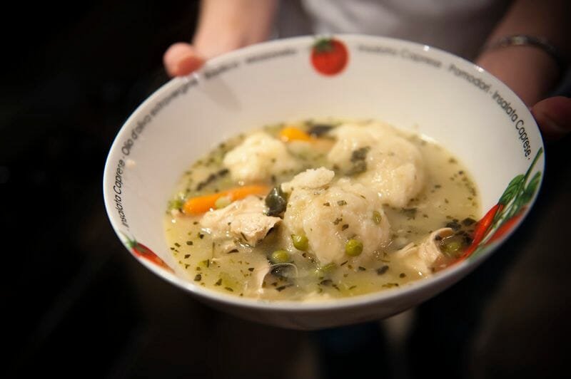 Gather up the remaining biscuit dough scraps and gently shape them into balls and drop them into the pot. Cover, reduce heat and simmer for another 10 to 15 minutes.