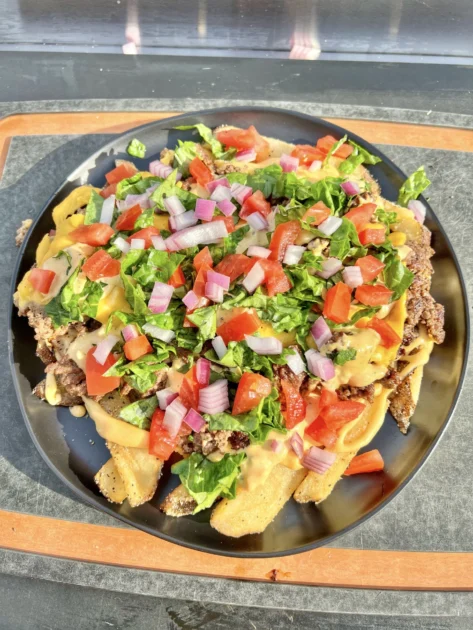 • Build the cheeseburger deluxe potato wedges, The wedges, cheese sauce, the chopped cheese burger, the sauce, lettuce, tomatoes and red onions.