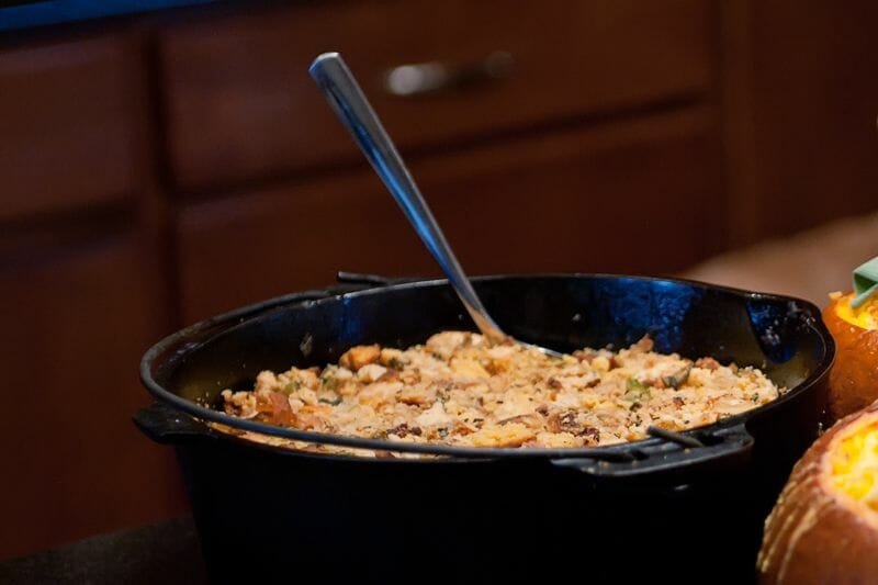 It works fine when we’re holding our Thanksgiving feast on a campsite but when I’m cooking in the kitchen I prefer to start my dressing with day-old, homemade biscuits and cornbread.