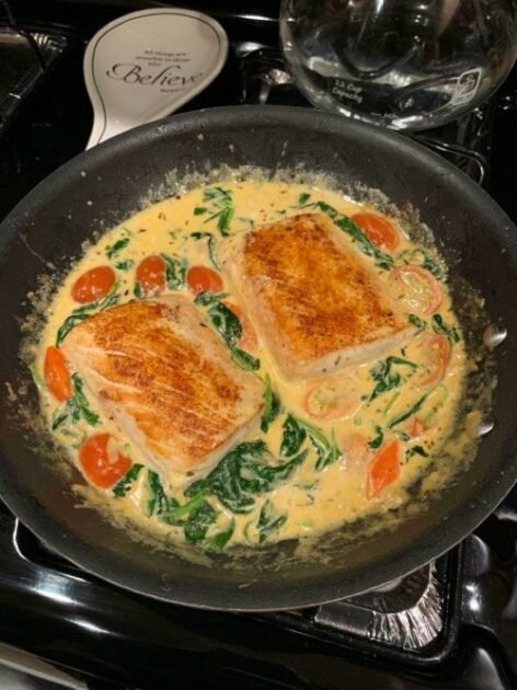 Add the chicken back to this pan, and then cook this until everything’s heated up all the way through, usually 5-7 minutes for best results