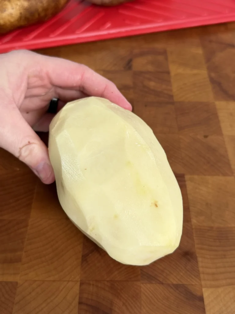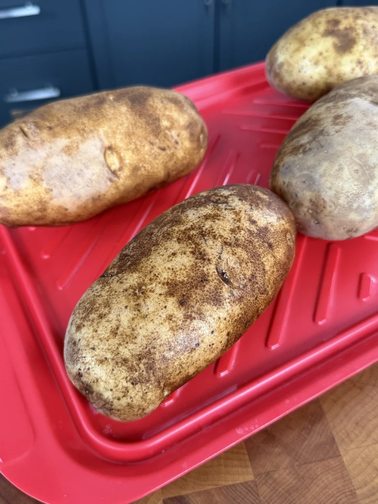 Wash 3 large russet potatoes thoroughly under cold running water, scrubbing with a vegetable brush to remove any dirt or debris. If you’re peeling the potatoes, do this now using a vegetable peeler, working lengthwise from one end to the other. Pat the potatoes dry with paper towels.