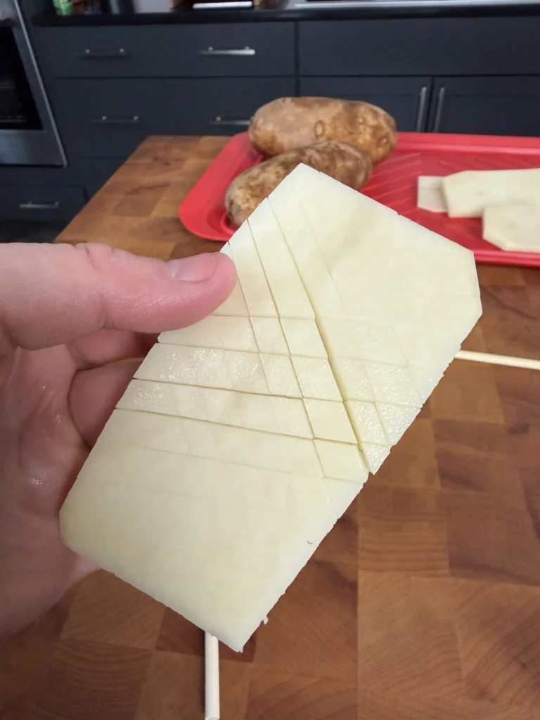 The spacing issue comes up when cooks thread the potato slices onto skewers but don’t fan them apart enough. When the slices touch each other, those contact points create pockets where moisture gets trapped and steam develops. The touching surfaces stay soft and pale while the exposed surfaces crisp. You need visible space between every slice to allow hot air to reach all the surfaces. If your accordion potatoes have soft spots between some slices but crispy spots on the most exposed edges, spacing is likely your problem.