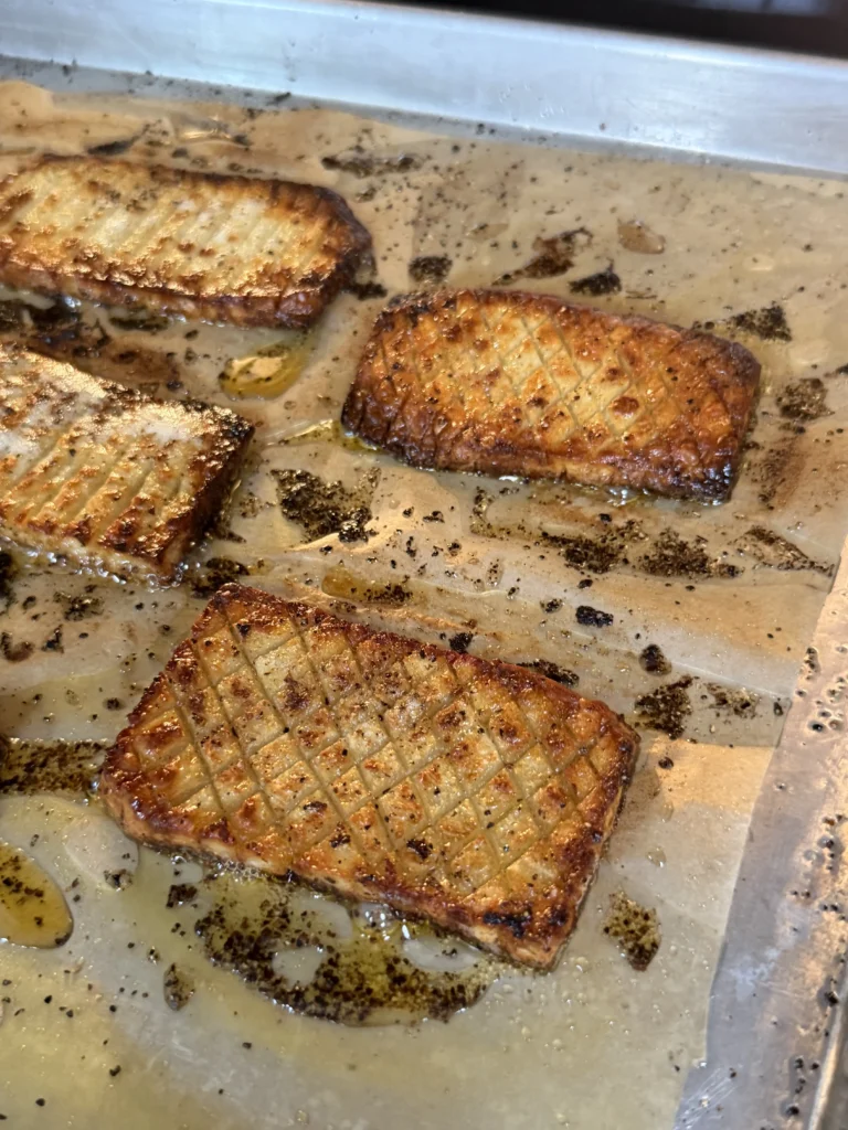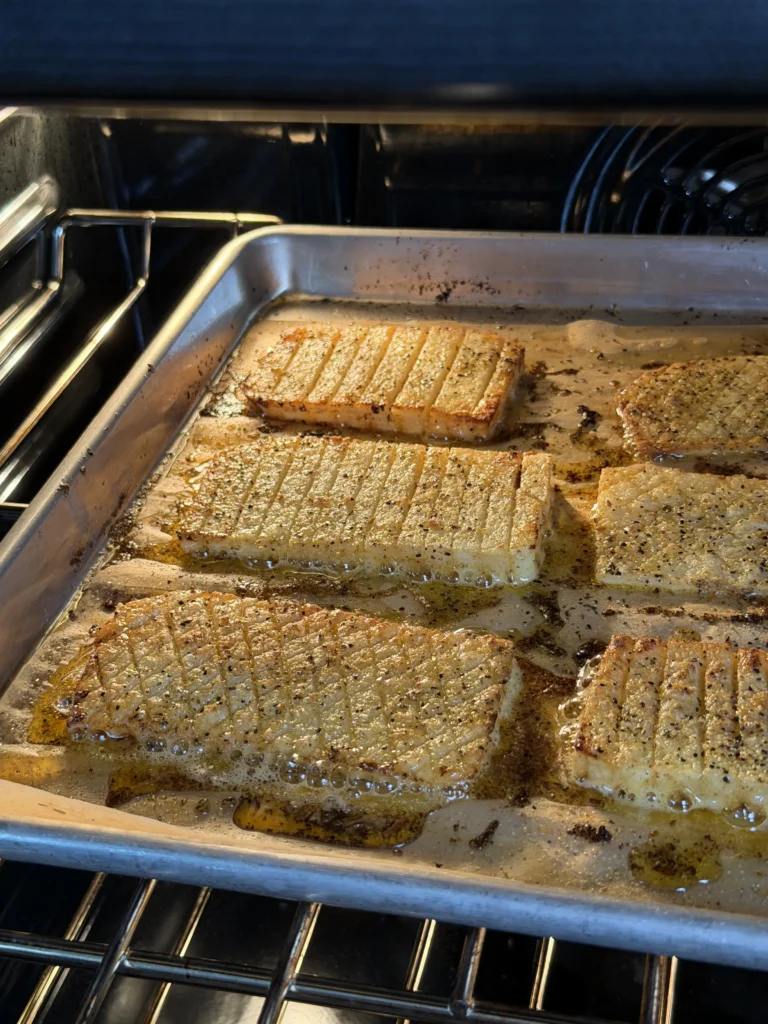 Don’t add the pepper, garlic powder, or paprika at this stage. These seasonings can burn during the long baking time, so you’ll add them later. The light salt coating at this point enhances flavor without interfering with crisping.