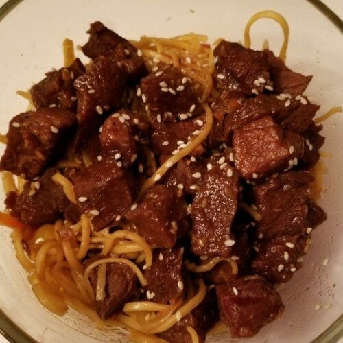 From there, cut up your sirloin so that it’s into tiny pieces. From there, put the sirloin in there, along with the sauce over the top of this. Mix this together in order to combine the sauce perfectly.