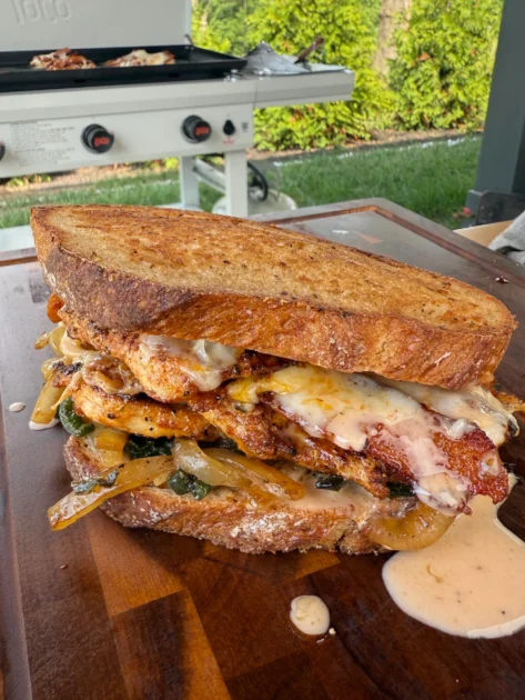 This easy chicken sandwich on the griddle delivers restaurant-quality results in just 20 minutes with perfectly seasoned thin-sliced chicken breast, crispy bacon, charred poblano peppers and onions, all topped with a tangy creamy sauce on toasted garlic butter sourdough. The griddle cooking method creates superior char and caramelization while cooking multiple components simultaneously, making this the perfect weeknight dinner when you want something special without the fuss.