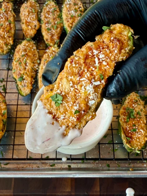 The jalapeños should become tender and slightly charred while the filling becomes golden and bubbly. Don’t flip the poppers – they cook from the bottom up. The peppers are done when they’re tender when pierced with a fork and the filling is heated through and lightly browned on top.