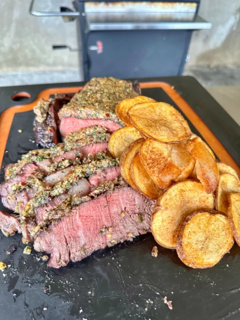 There are a lot of options when it comes to sides for any steak. For this particular recipe, I made homemade fried potato chips. These potato chips are outstanding and it’s all about what you use to fry the potato chips in and the finishing dust for the best flavor.