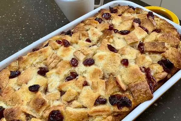 Combine toasted bread cubes and raisins in prepared casserole. Set aside.