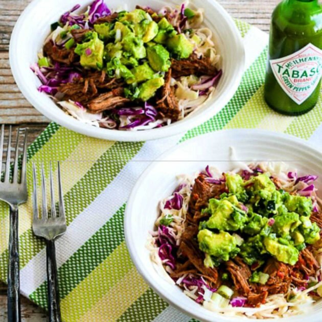 Green Chile Beef Cabbage Bowl with Avocado Salsa (Slow Cooker or Pressure Cooker) found on KalynsKitchen.com