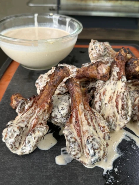 While the drumsticks are resting, prepare the Alabama White Sauce. In a medium-sized bowl, combine 2 cups of mayonnaise, ½ cup of apple cider vinegar, ¼ cup of Dijon mustard, ⅛ cup of brown sugar, 1.5 tablespoons of prepared horseradish, 1 tablespoon of hot sauce, 2 teaspoons of cayenne powder, and 2 teaspoons of honey. Mix all the ingredients thoroughly until you achieve a smooth, homogeneous sauce. This tangy and spicy sauce perfectly complements the smoky, spicy chicken, adding a unique flavor profile that enhances the overall dish. Store the sauce in the refrigerator until you’re ready to serve.