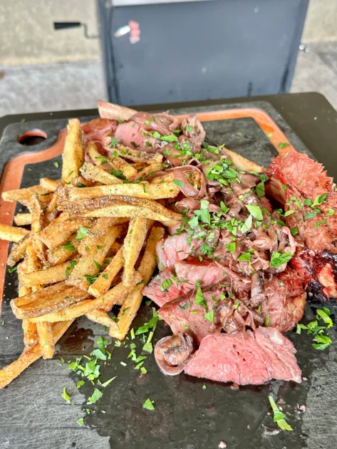 These steaks will be Seasoned generously with only salt and then grilled over direct flames so we can really enjoy the pure goodness of the tender juicy ribeye steak. Also, they will be served with crispy parmesan truffle fries!