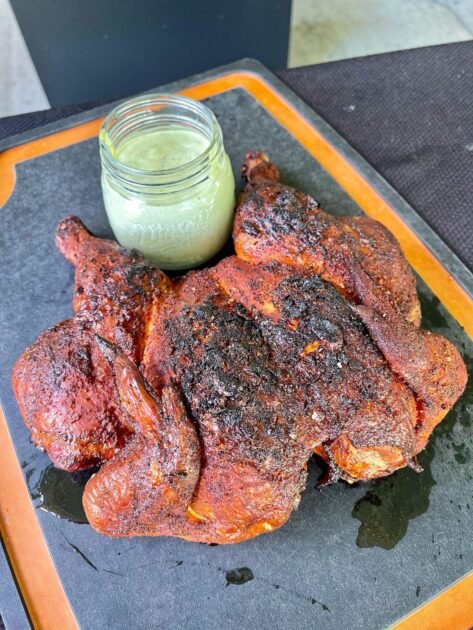 If you are like me you love to grill chicken. At times it can be redundant because you find yourself using the same recipe over and over. This sweet and spicy spatchcock chicken recipe will change that, along with the cilantro-lime dipping creamy dipping sauce! I can use this sauce for anything, to be honest.