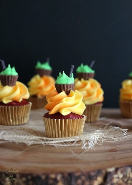 These adorable Halloween cupcakes are so cute with minimal effort! Little bubbling peanut butter cup cauldrons on a piped orange flame swirl!