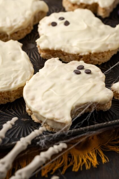 - Don’t feel like dipping your ghosts? Melt your white candy disks and use an offset spatula to spread the chocolate over your Krispie treats. It’s a little less messy.