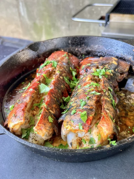 • Once flipped, baste the lobster with the butter every 5-7 mins. This will help cook the lobster inside of the shell.