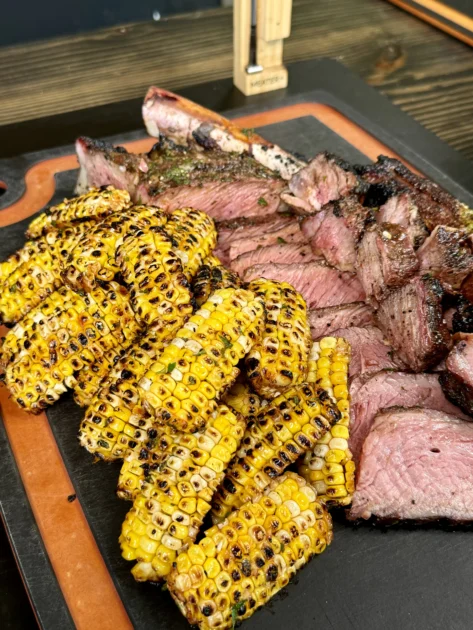 Slice the rested steak and serve it alongside the corn ribs. Enjoy!