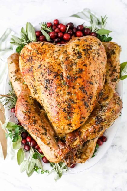 Cook a turkey at 325°F. Place turkey, breast side up in a sturdy shallow pan that can hold the juices as the turkey roasts, you’ll need these juices to make gravy!