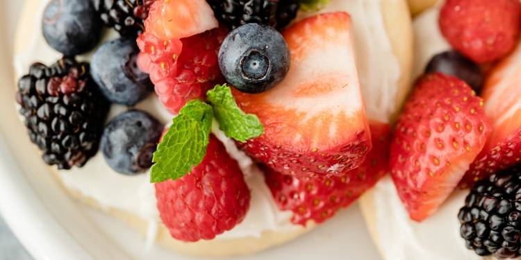 Strawberries, blueberries, blackberries, and mint fruit pizza
