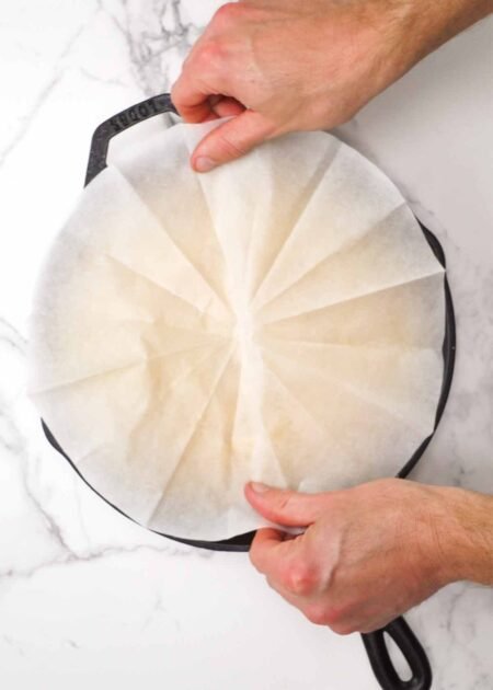 Cut a square piece of baking paper just big enough to cover your cast-iron pan, pot, or whatever you are covering. Then fold it in half on the diagonal.