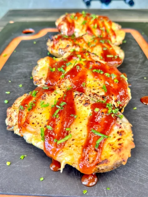 Place the smoked jalapeño popper potato skins on the smoker, or oven, at 425 degrees F for an additional 25 minutes. The cheese will be nice and melted on top and the core will be gooey with the outer skin of the potato being crispy. Remove and top with bbq sauce and diced chives. Serve and enjoy!