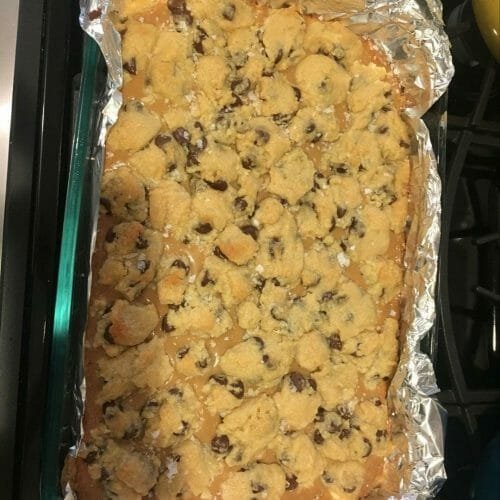 Turn out the remaining cookie dough on the work surface. Use your hands to press it into a large square a little smaller than the pan. Then use a spatula to remove it from the surface and set it on top of the caramel and chocolate chips.