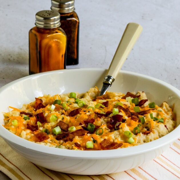Everything used in Loaded Cauliflower Mash is a low-carb ingredient and this recipe would be great for low-carb or Keto eating plans. If you’re strictly following the original South Beach Diet, this would be high in fat, although you could use low-fat cheese and cream cheese and go easy on the butter and bacon (or use turkey bacon) to make a version that might be okay for an occasional treat on South Beach.