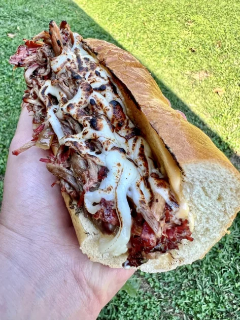 5. At this point you want to remove the chuck roast from the dutch oven and place in an aluminum pan and rest for 20-30 mins. At this point, shred the chuck roast and place back in the dutch oven with the juice. Simmer for an additional 20-30 mins.